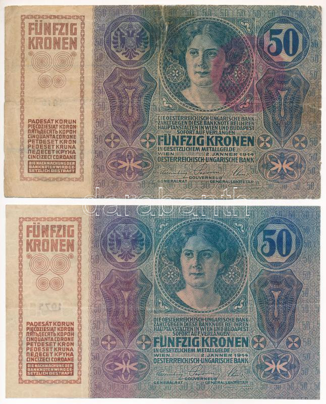 Leírás: 1914. 50K (2db) egyik piros "MAGYARORSZÁG" felülbélyegzéssel T:F,VG egyiken tűly., másikon beszakadások