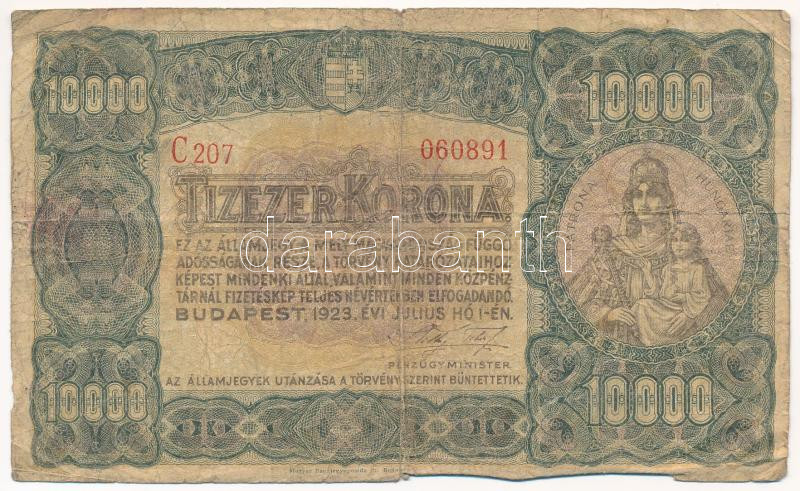 Leírás: 1923. 10.000K "Magyar Pénzjegynyomda Rt." nyomdahely jelöléssel, piros sorozat-és sorszámmal "C207 060891" T:VG restaurált Adamo K42