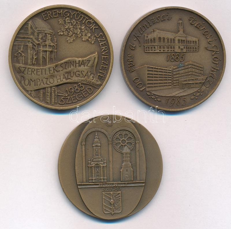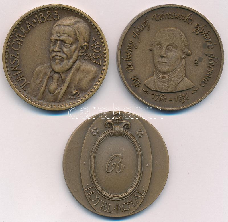 Leírás: 3db-os bronz emlékérem tétel, közte "Juhász Gyula, 100 éves a Kanizsai városi kórház, Hotel Royal - Szeged" (42,5mm/db) T:1,1- patina