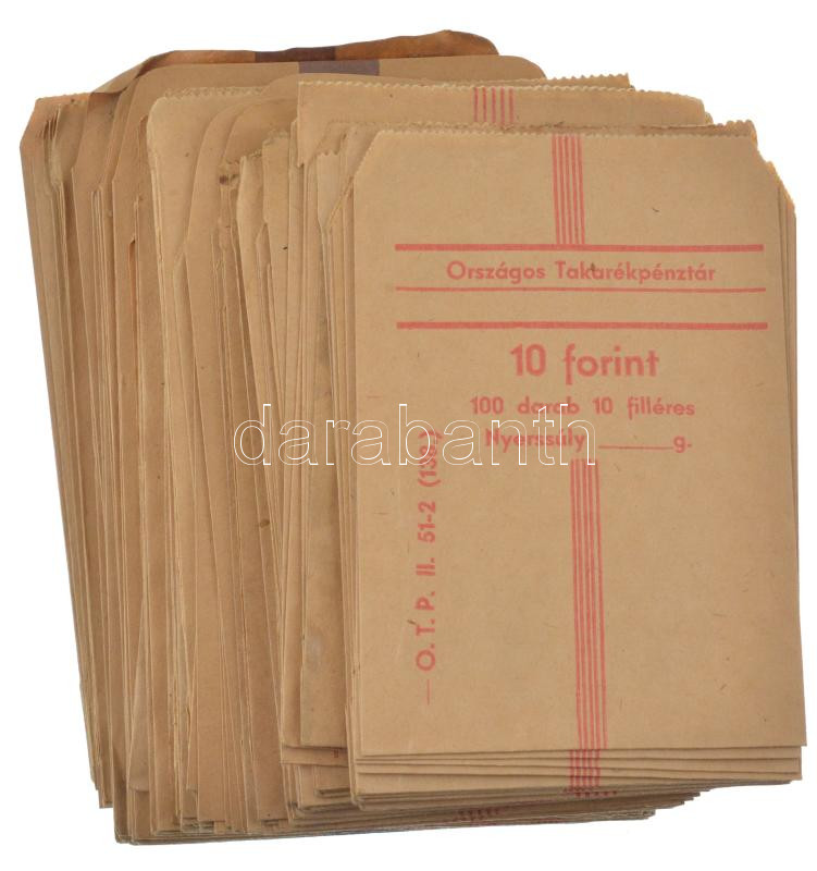 "Országos Takarékpénztár" kitöltetlen, használatlan, új állapotú fémpénzes papírzacskók (~108x), 10f, 50f, 1Ft, 2Ft, 10Ft-os érmék számára, közte pár foltos is.