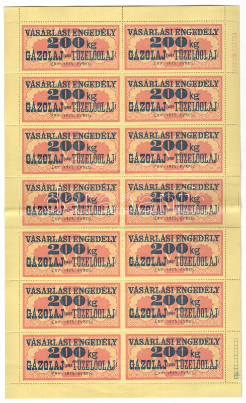 Leírás: 1975. "Vásárlási engedély - 200kg Gázolaj vagy Tüzelőolaj" (14x) bélyeg, teljes ív T:II-