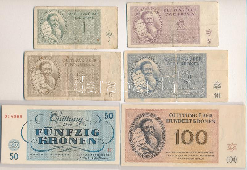 Leírás: Német Harmadik Birodalom / Cseh-Morva Protektorátus / Theresienstadt gettó 1943. január 1. 1K + 2K + 5K (3x) + 10K + 20K (2x) + 100K helyi pénz T:AU-F