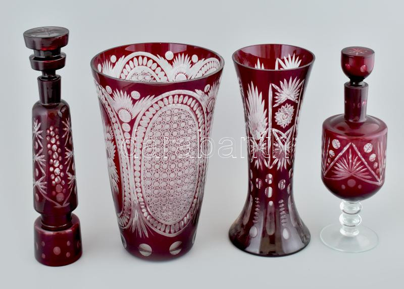 Leírás: cca 30 darabos bordó kristály gyűjtemény, közte italos készlet, pohárkészlet, kínáló, váza, szép állapotban, vegyes méretben, egyik címkével jelzett