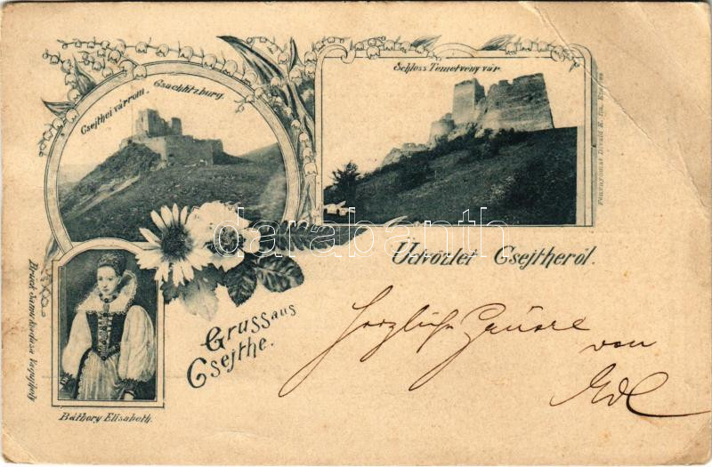 Leírás: 1898 (Vorläufer) Csejte, Csejthe, Cachtice; Temetvény vár, Csejthei várrom, Báthory Erzsébet. Brück Samu kiadása / castles ruins, Báthory. Art Nouveau, floral (vágott / cut)