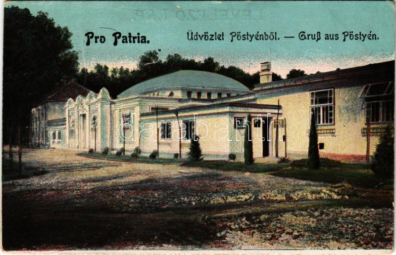 Leírás: 1916 Pöstyén, Piestany; Pro Patria katonai szanatórium és fürdő. Gipsz H. kiadása / spa, military sanatorium (Rb)