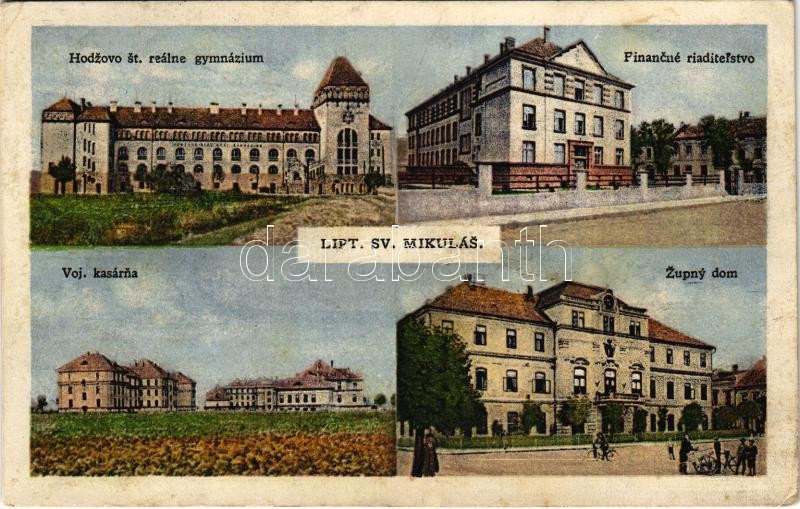 Leírás: 1930 Liptószentmiklós, Liptovsky Mikulás; Hodzovo st. reálne gymnázium, Financné riaditelstvo, Zupny dom, Voj. kasárna / Reálgimnázium, Pénzügyi Igazgatóság, laktanya, megyeház / school, financial directorate, county hall, military barracks (EB)