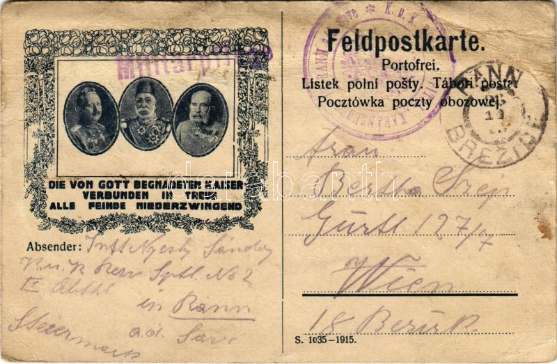 1915 Die von Gott begnadeten Kaiser verbunden in Treue alle Feinde Niederzwingend / Első világháborús tábori postai levelezőlap a Központi Hatalmak uralkodóival: V. Mehmed, II. Vilmos, I. Ferenc József / WWI Austro-Hungarian K.u.K. military field postcard, Viribus Unitis and Central Powers propaganda: Mehmed V, Wilhelm II, Franz Joseph I of Austria. Feldpostkarte (gyűrődés / crease)