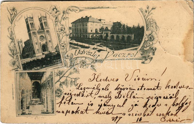 Leírás: 1899 (Vorläufer) Vác, székesegyház, belső, Püspöki rezidencia. Pick testvérek kiadása, Art Nouveau, floral (szakadás / tear)