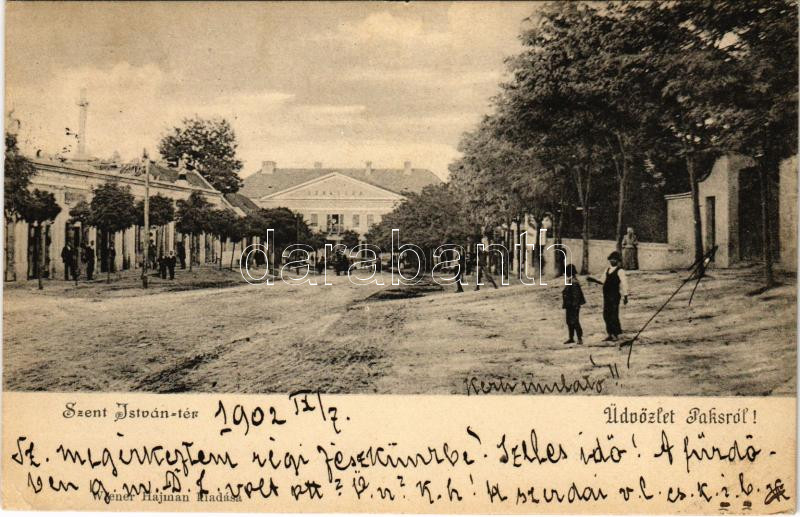 1902 Paks, Szent István tér, Erzsébet nagy szálloda, Bazársor tetején Szent Vendel, Szent Flórián és Nepomuki Szent János szobor. Wiener Hajman kiadása (EK)