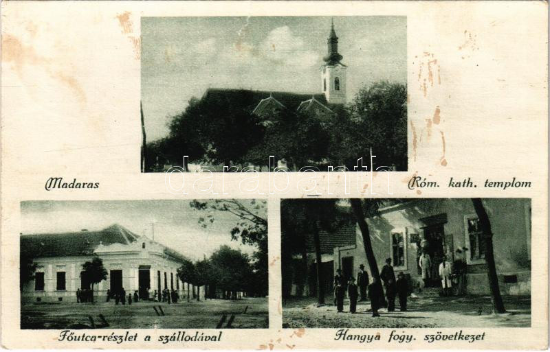 Leírás: 1926 Madaras, Római katolikus templom, Fő utca, szálloda, Hangya szövetkezet üzlete (fl)