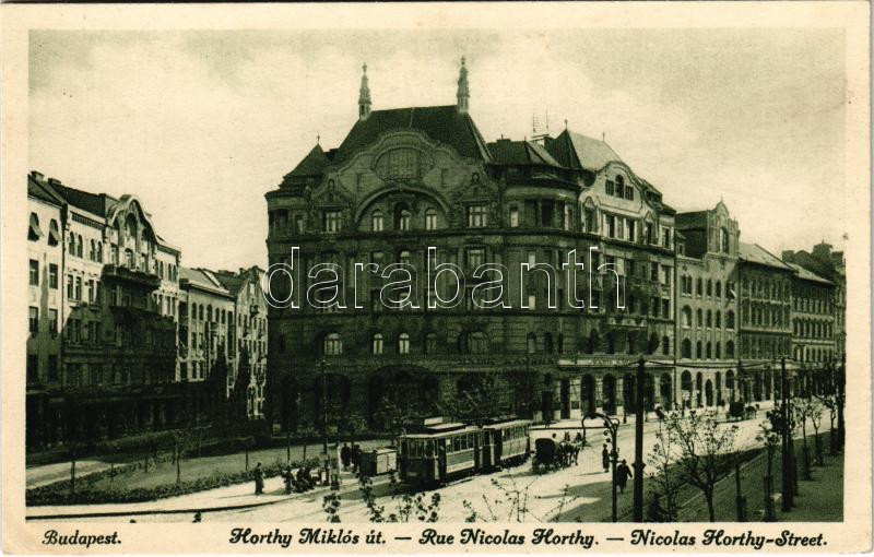 Leírás: Budapest XI. Horthy Miklós út (ma Bartók Béla út), villamos, Hadik kávéház (legendás hely Karinthy, Kosztolányi, Déry és Móricz is ide járt) (EK)