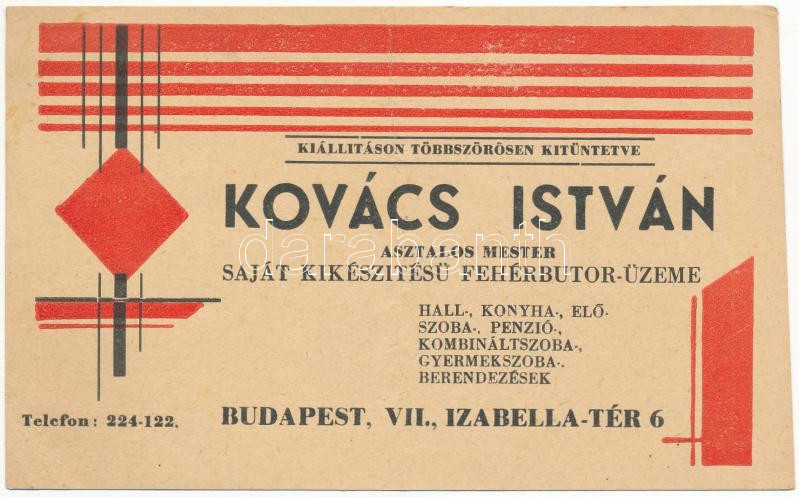 Kovács István asztalos mester saját készítésű fehérbútor üzeme. Budape... https://www.darabanth.com/hu/441-Gyorsarveres/441.0/Kepeslapok/Reklam~1500044/Kovacs-Istvan-asztalos-mester-sajat-keszitesu-feherbutor-uzeme-Budapest-Izabella-ter-6~II2895750
