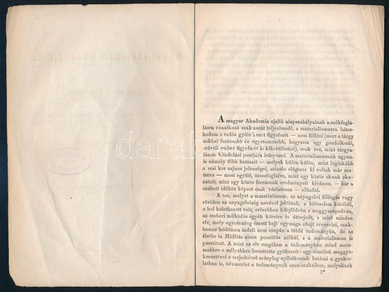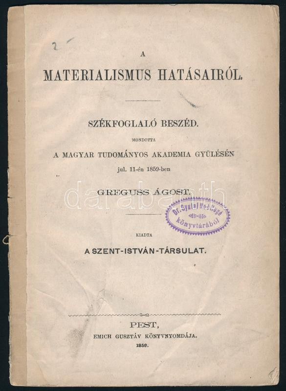 Leírás: Greguss Ágost: A materialismus hatásáról. Székfoglaló beszéd. a Magyar Tudományos Akadémia ülésén. Pest, 1859. Emich. 32p. Papírgerinccel