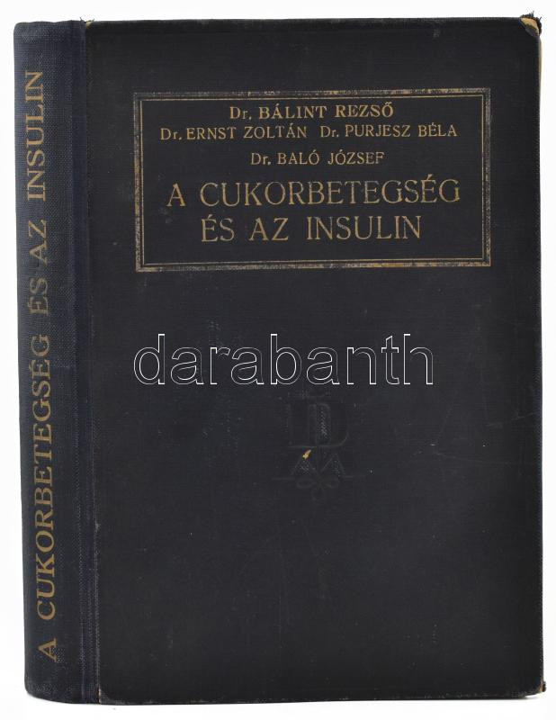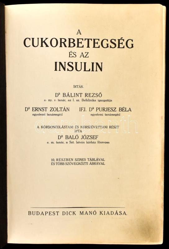 Dr. Bálint Rezső et al.: A cukorbetegség és az insulin. Bp., [1927], Dick Manó (Hornyánszky-ny.), 304+(8) p. + X t. Fekete-fehér és színes képtáblákkal, hirdetésekkel. Kiadói aranyozott egészvászon-kötés, kissé sérült, kopottas borítóval.