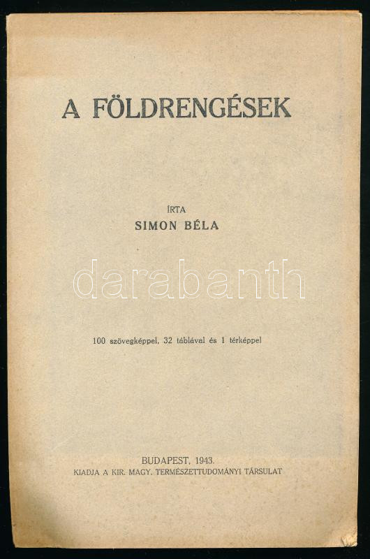 Simon Béla: A földrengések. Bp., 1943, K. M. Természettudományi Társulat, 1 kihajtható térkép + 183 p. + XXXII t. Fekete-fehér képekkel illusztrálva. Kiadói papírkötés, sérült, szétváló fűzéssel.