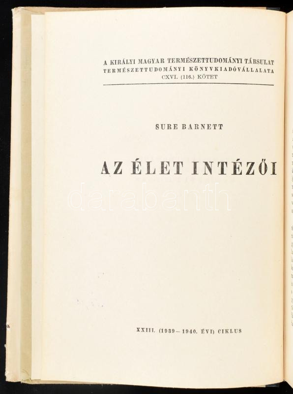 Sure, Barnett: Az élet intézői. Bp., 1940, K. M. Természettudományi Társulat, X+(2)+350 p.+ XVI t. Fekete-fehér fotókkal illusztrálva. Kiadói félvászon-kötés, kissé sérült kiadói papír védőborítóban.