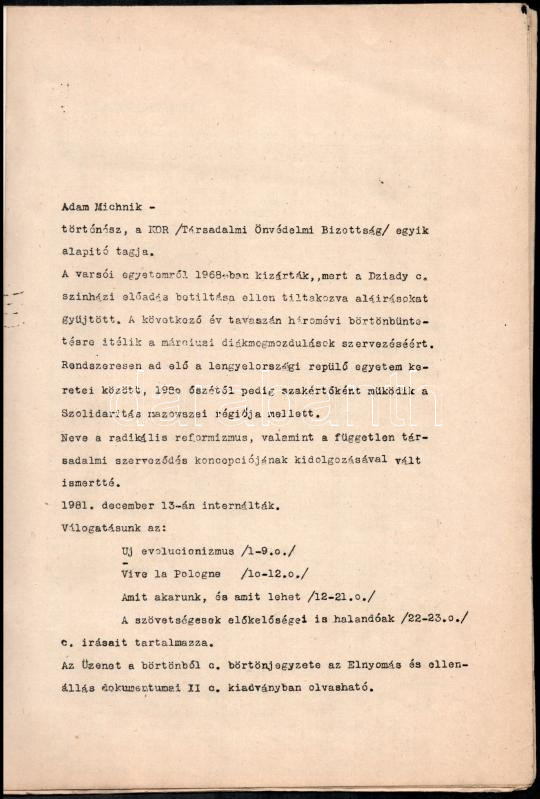 Adam Michnik: Amit akarunk, és amit lehet. ElÅ‘adások és cikkek a lengyel ellenzék programjáról 1976-1981. Bp., 1982, AB Független Kiadó, (1)+23 p. Szamizdat kiadás. Kiadói tűzött papÃrkötés, a borÃtó részben szétvált tűzéssel.