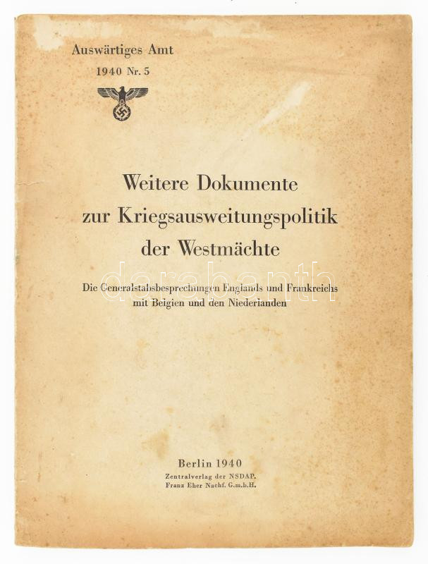 Weitere Dokumente zur Kriegsausweitungspolitik der Westmächte. Die Generalstabsbesprechungen Englands und Frankreichs mit Belgien und den Niederlanden. Auswärties Amt 1940 Nr. 5. Berlin, 1940., Zentralverlag der NSDAP Frenz Eher Nachf. G.m. b. H. Kihajtható térképpel. Német nyelven. Kiadói papírkötés, kissé foltos borítóval, a gerincen sérüléssel, egy lap (5/6.) sarkán nagyméretű hiánnyal.