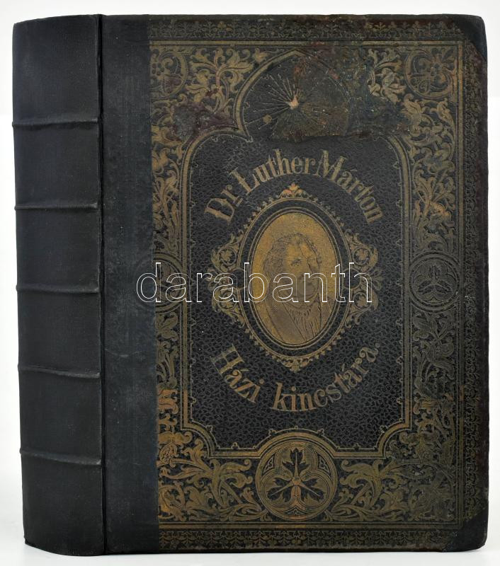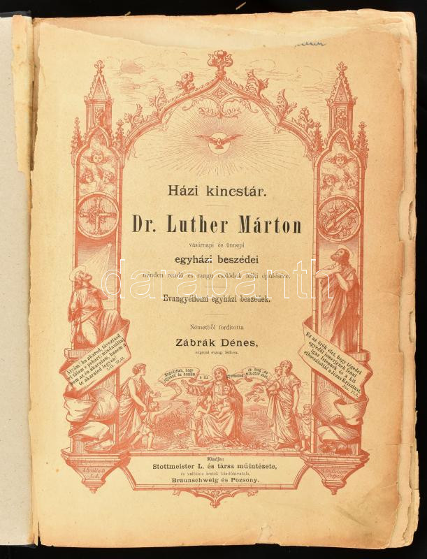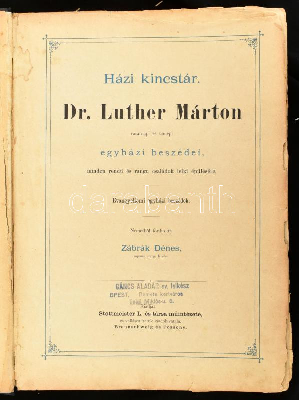 Luther Márton: Házi kincstár. Dr. Luther Márton vasárnapi és ünnepi egyházi beszédei, minden rendü és rangu családok lelki épülésére. Evangyéliumi egyházi beszédek. Ford.: Zábrák DÉnes. Braunschweig és Pozsony, én., Stottmeister L és Tsa. Műintézete, 12+1040 p. Egészoldalas illusztrációkkal. Javított gerincű aranyozott egészvászon-kötés, javított kötéssel az első néhány lapon kis szakadásokkal, ceruzás aláhúzásokkal, bejelölésekkel.