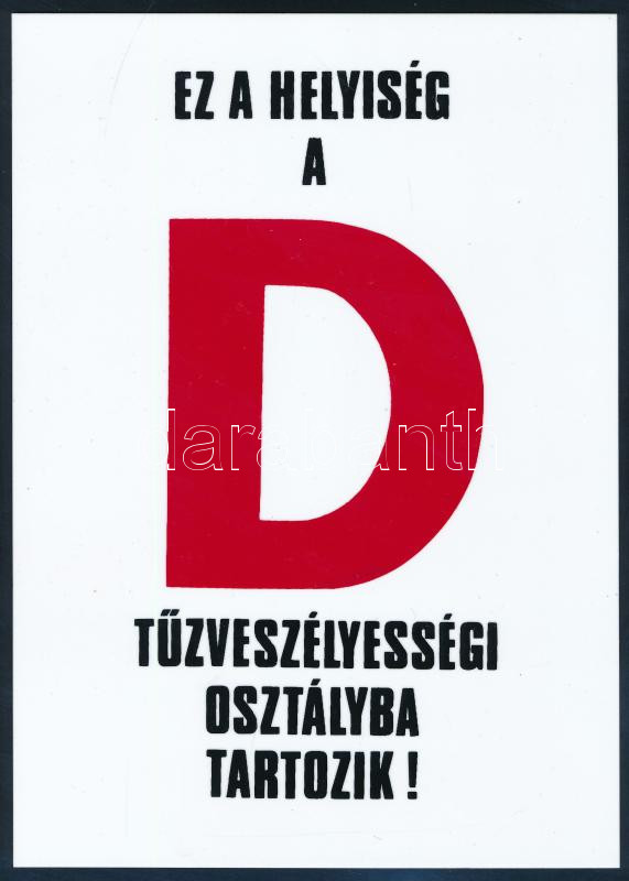 Leírás: 2 darab "Ez a helyiség D tűzveszélyességi osztályba tartozik!" feliratú műanyag tábla, 25x18 cm