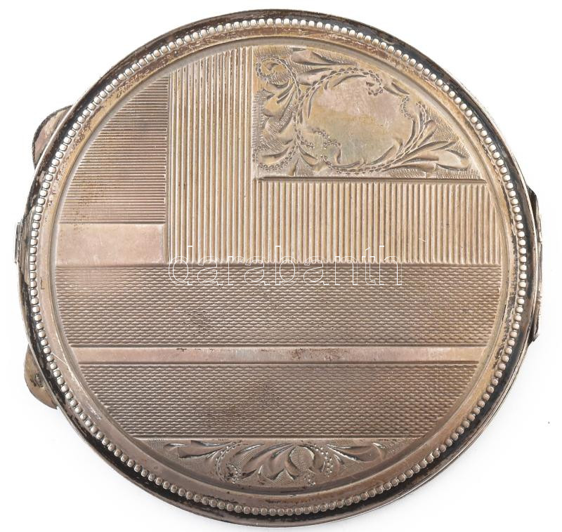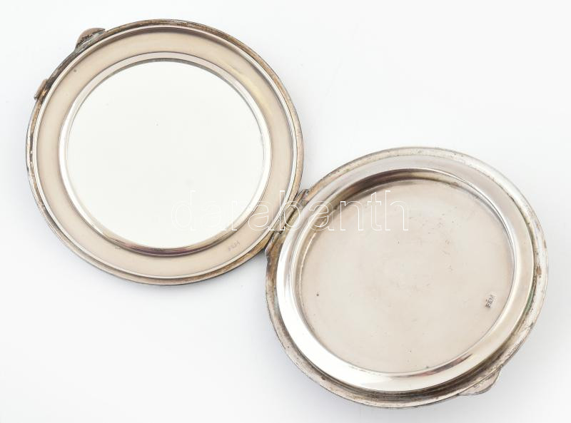 Díszes kerek pudrié tükörrel, belül "FÉM" jelzéssel, d: 8 cm https://www.darabanth.com/hu/441-Gyorsarveres/441.0/Mutargy-papirregiseg-egyeb/Bolhapiac~500016/Diszes-kerek-pudrie-tukorrel-belul-FEM-jelzessel-d-8-cm~II2902207