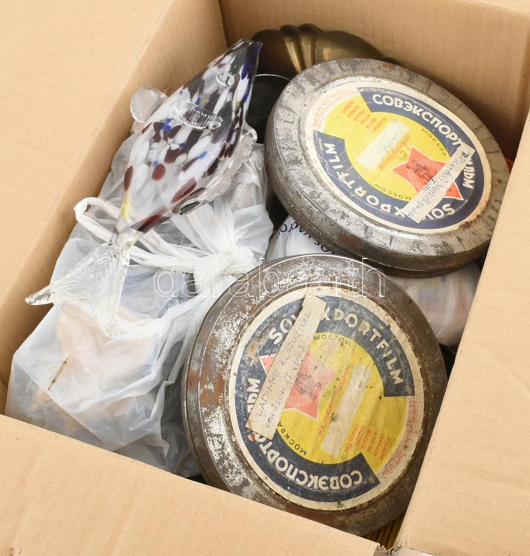 Leírás: Egy kartondoboznyi vegyed bolhapiac tétel, közötte film, üveghal, tollak, cigarettás dobozok, stb