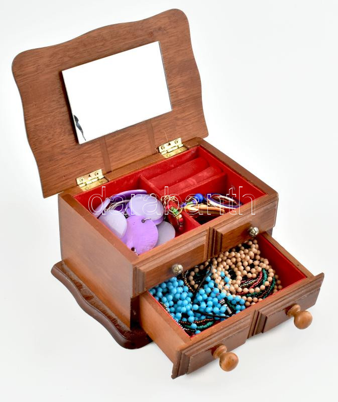 Leírás: Ékszeres fa fiókos díszdoboz bizsu tartalommal, kis kopottsággal, 18,5x12,5x9,5 cm