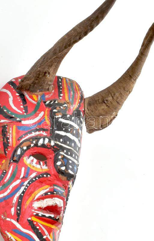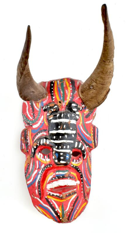 Leírás: Faragott és festett fa maszk szarvakkal, kopásokkal, m: 38 cm