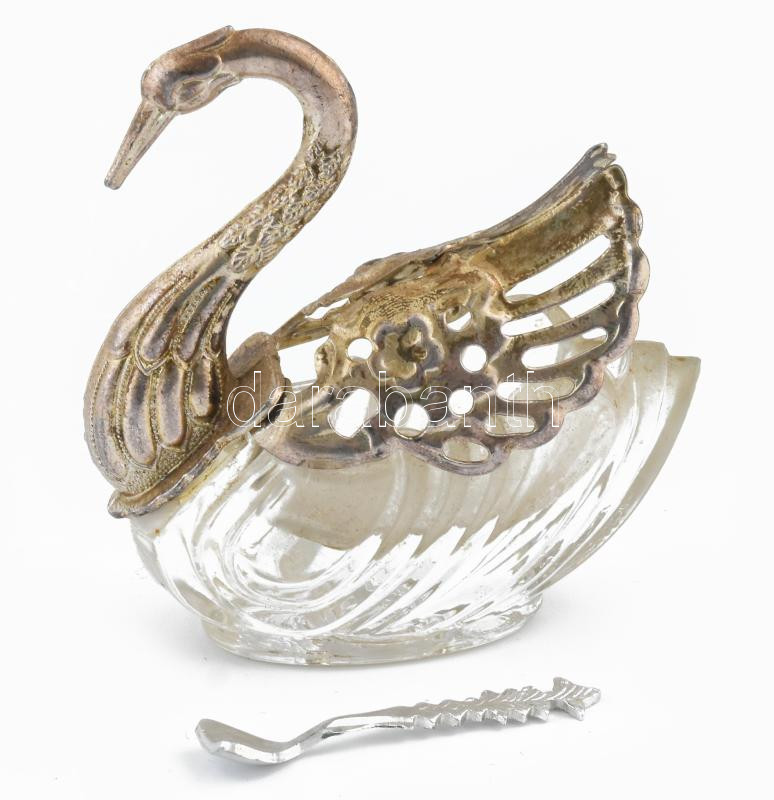 Leírás: Hattyú sótartó, fém üveg, kis kanállal 7 cm