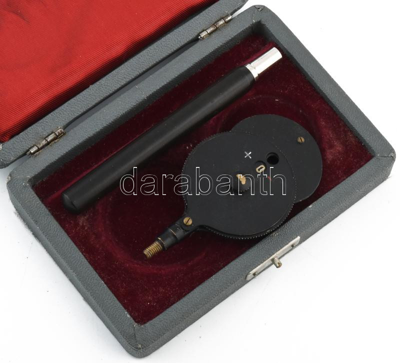 Leírás: Régebbi fém szemvizsgáló optikai eszköz, rácsavarható menetes szárral, jelzés nélkül, bélelt dobozban, h: 17 mm