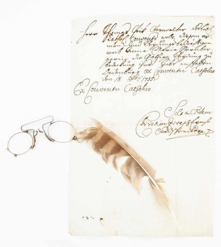 Leírás: Régi íróasztal felszerelés: Antik csíptetős szemüveg, törött, egy üveggel írótoll, 1755-ös kéziratos okmány