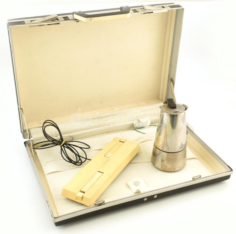 Leírás: Szovjet aktatáska, benne dupla teleszkópos antenna erősítő, négy személyes kotyogó kávéfőző, jó állapotban