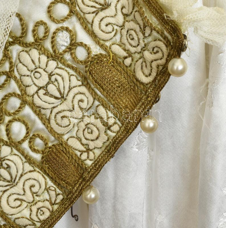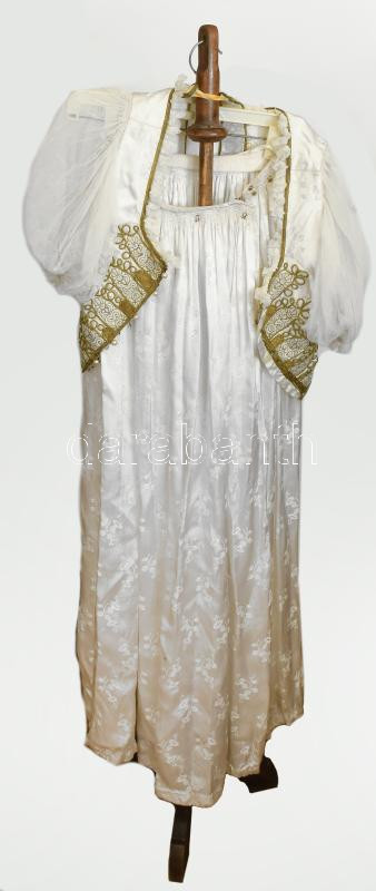 Leírás: Fehér női díszmagyar kompletten gyöngyös mentével, pártával, hosszú szoknyával. Korabeli állványon.