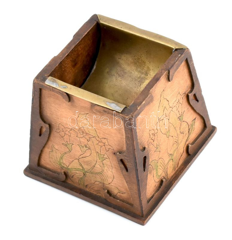 Leírás: Szecessziós antik bélyegtartó. Réz,. fa, faragott m: 6,5 cm
