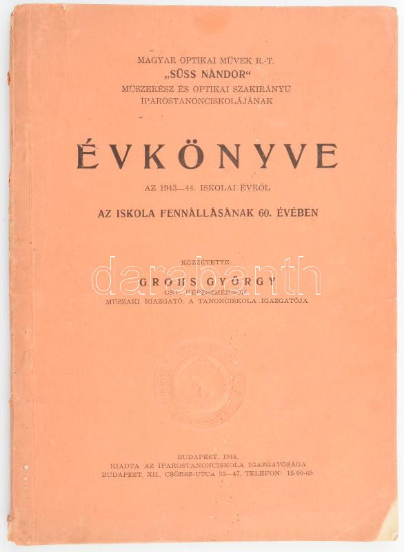1944 Magyar Optikai Művek Rt. "Süss Nándor" műszerész és optikai szakirányú iparostanonciskolájának évkönyve az 1943-44. iskolai évrÅ‘l. Bp., Bethánia-ny., 53+(1) p. + 8 t. Egészoldalas fekete-fehér képekkel illusztrált. Kiadói tűzött papÃrkötés, kissé sérült, a könyvtesttÅ‘l elvált borÃtóval.