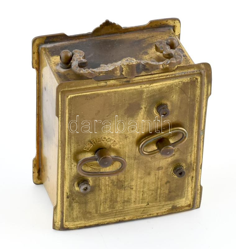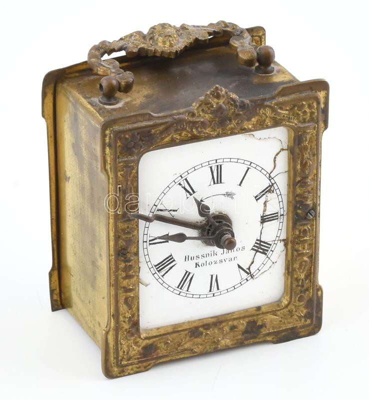 Leírás: Hussnik János Kolozsvár asztali óra, réz házzal, sérülésekkel, nem működik, m: 9 cm