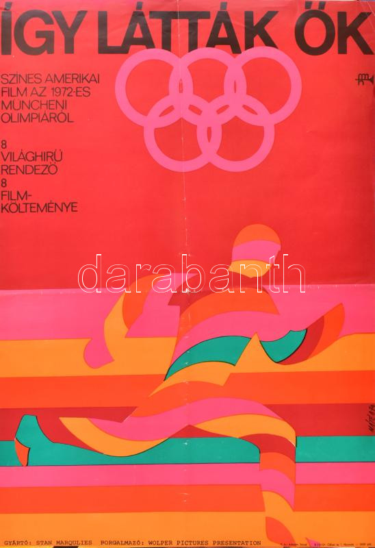 1974 Máté András (1921-2000):"Így látták ők", színes amerikai film az 1972-es müncheni olimpiáról, film plakát, Magyar Hirdető, Bp., Offset-ny., hajtás- és kopásnyomokkal,60x40 cm