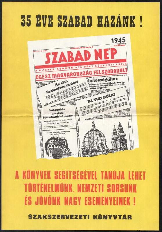 1980 "35 éve szabad hazánk!", Szakszervezeti Könyvtár plakát, középen ... https://www.darabanth.com/hu/441-Gyorsarveres/441.0/Mutargy-papirregiseg-egyeb/Plakat~500033/1980-35-eve-szabad-hazank-Szakszervezeti-Konyvtar-plakat-kozepen-hajtott-40-5x28-cm~II2896273