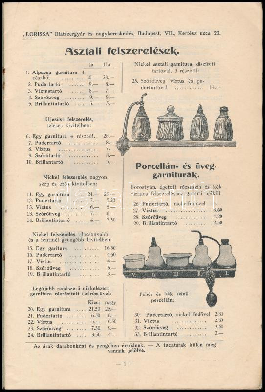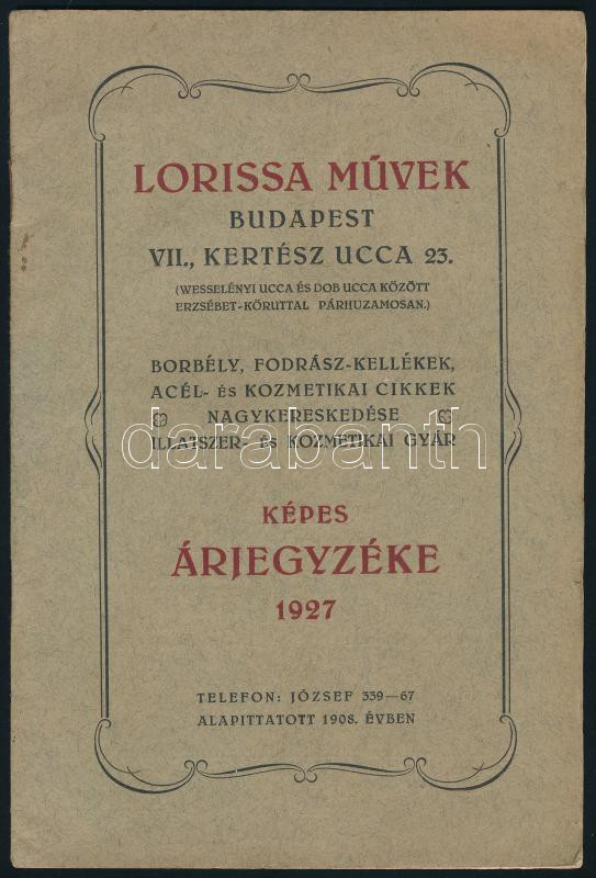 1927 Lorissa Művek (Bp. VII., Kertész u. 23.) borbély, fodrász-kellékek, acél- és kozmetikai cikkek, nagykereskedése, illatszer- és kozmetikai gyár képes árjegyzéke, 26 p.