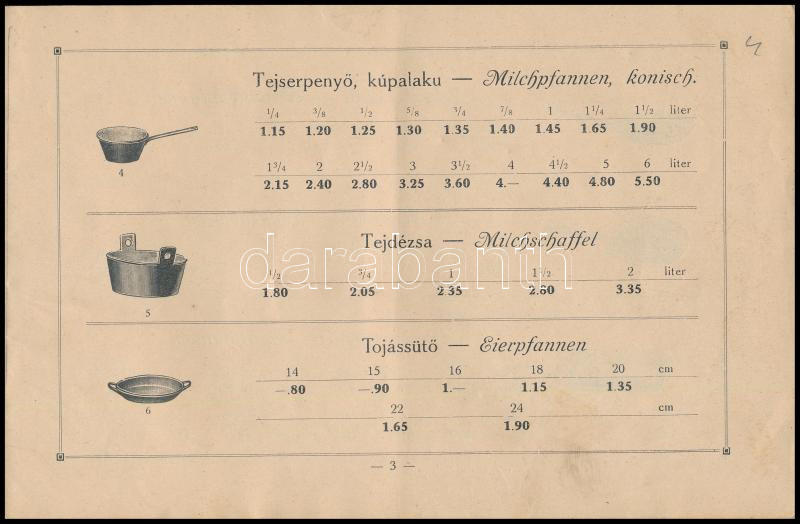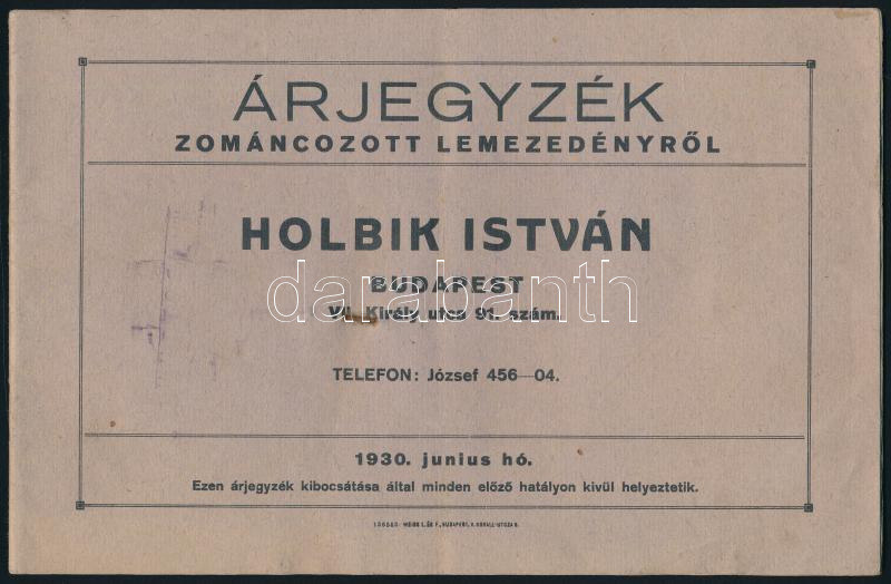 1930 Bp., Holbik István zománcozott lemezedény árjegyzék, ceruzás beje... https://www.darabanth.com/hu/441-Gyorsarveres/441.0/Mutargy-papirregiseg-egyeb/Reklam~500026/1930-Bp-Holbik-Istvan-zomancozott-lemezedeny-arjegyzek-ceruzas-bejegyzesekkel-az-elso-ol~II2900115