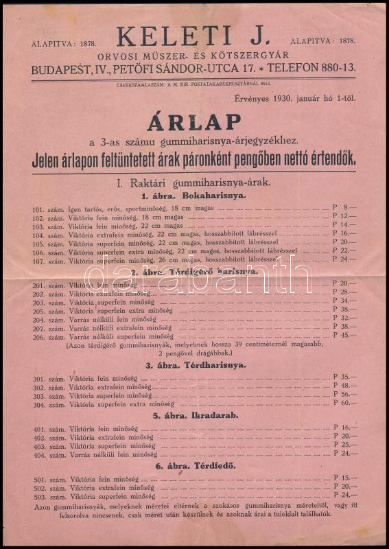 Leírás: 1930 Bp. IV. Petőfi Sándor utca, Keleti J. orvosi műszer- és kötszergyár árlapja