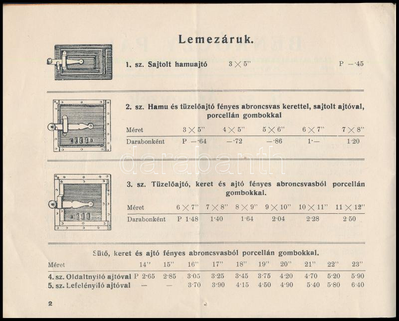 Leírás: 1932 Szeged, Benkóczy Pál első alföldi lemezáru- és butorzárgyár, 5. sz. árjegyzék, a borító két oldalán ceruzás feljegyzésekkel, 12 p.