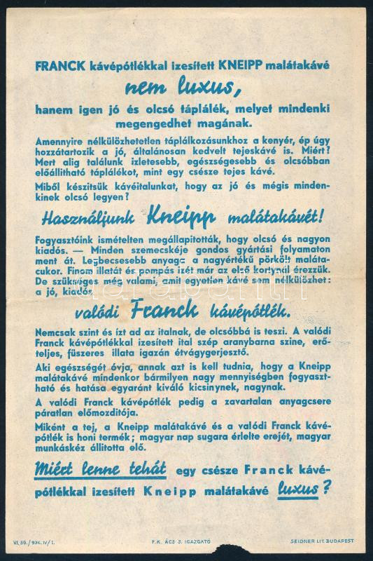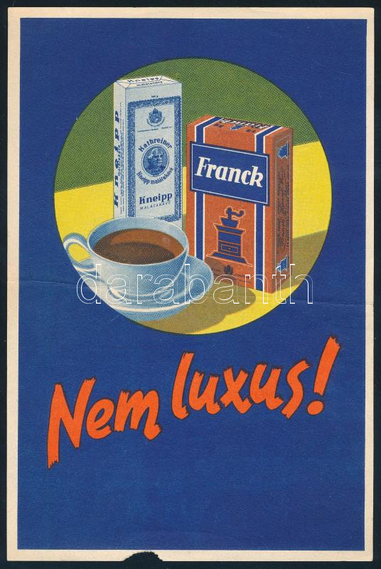 Franck kávé - Nem luxus! kétoldalas reklámnyomat, 20×13 cm https://www.darabanth.com/hu/441-Gyorsarveres/441.0/Mutargy-papirregiseg-egyeb/Reklam~500026/Franck-kave-Nem-luxus-ketoldalas-reklamnyomat-20C39713-cm~II2902641