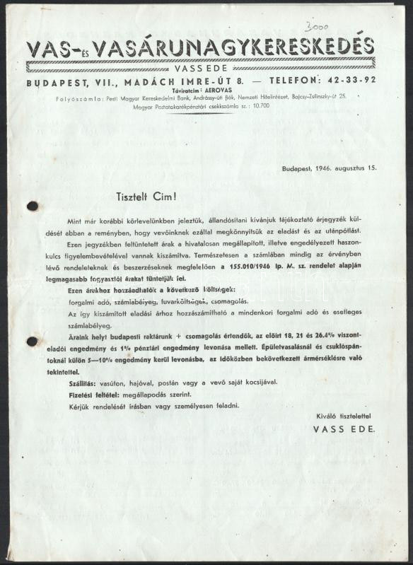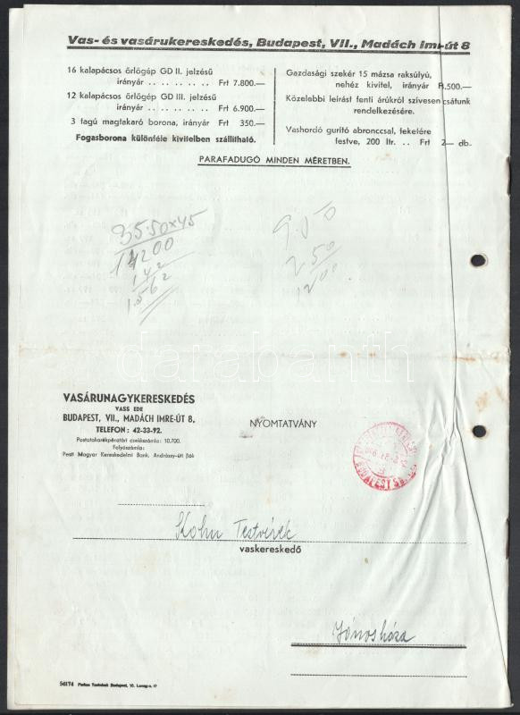 cca 1945 Vass Ede Vasárunagykeeskedése reklám árjegyzék 12p. https://www.darabanth.com/hu/441-Gyorsarveres/441.0/Mutargy-papirregiseg-egyeb/Reklam~500026/cca-1945-Vass-Ede-Vasarunagykeeskedese-reklam-arjegyzek12p~II2897414