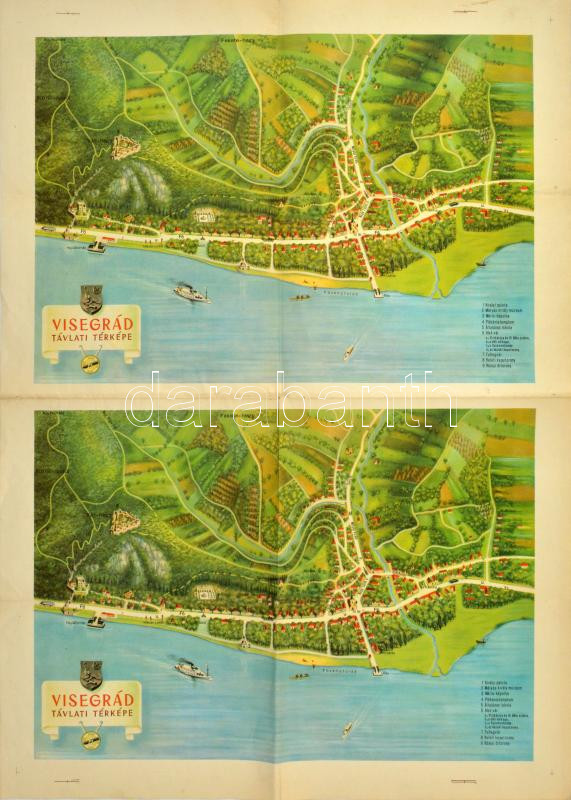1959 Visegrád távlati térképe (2 példány, felvágatlan íven), Bp., Kartográfiai Vállalat (Offset-ny.), hátoldalán többnyelvű szöveggel, az ív közepén kis szakadással, 70x50 cm