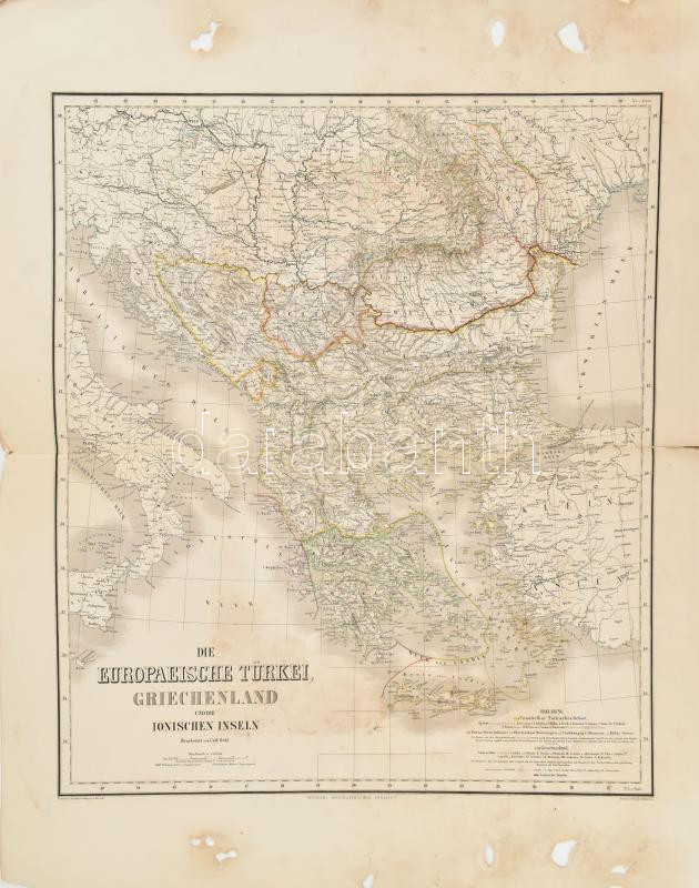 Az európai Törökország, Görögország és környező szigetek, valamint Magyarország és a Balkán-félsziget térképe (Die europäische Türkei, Griechenland und die ionischen Inseln), XIX. sz. közepe, határszínezett rézmetszet, 73x60 cm, 1:3000000, lapszéli sérülésekkel, kissé foltos