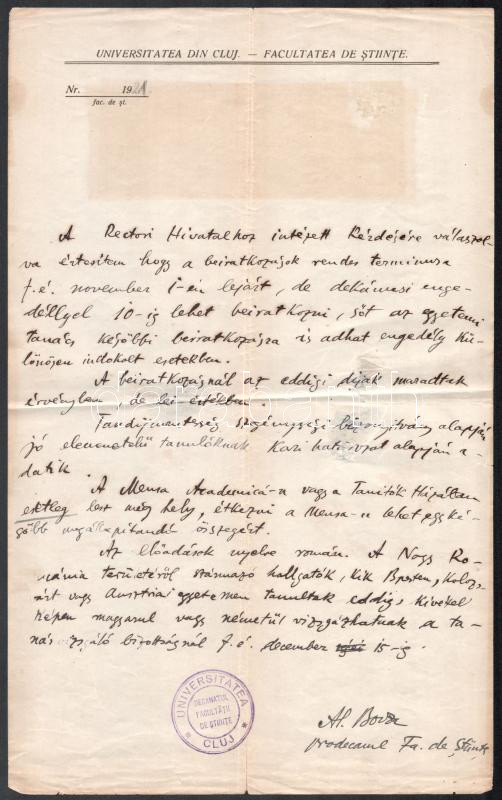 Leírás: 1921 A Kolozsvári Egyetem dékánjának tájékoztató levele az új tanrendről, tanítási nyelvről, a magyar nyelvű vizsgázásról