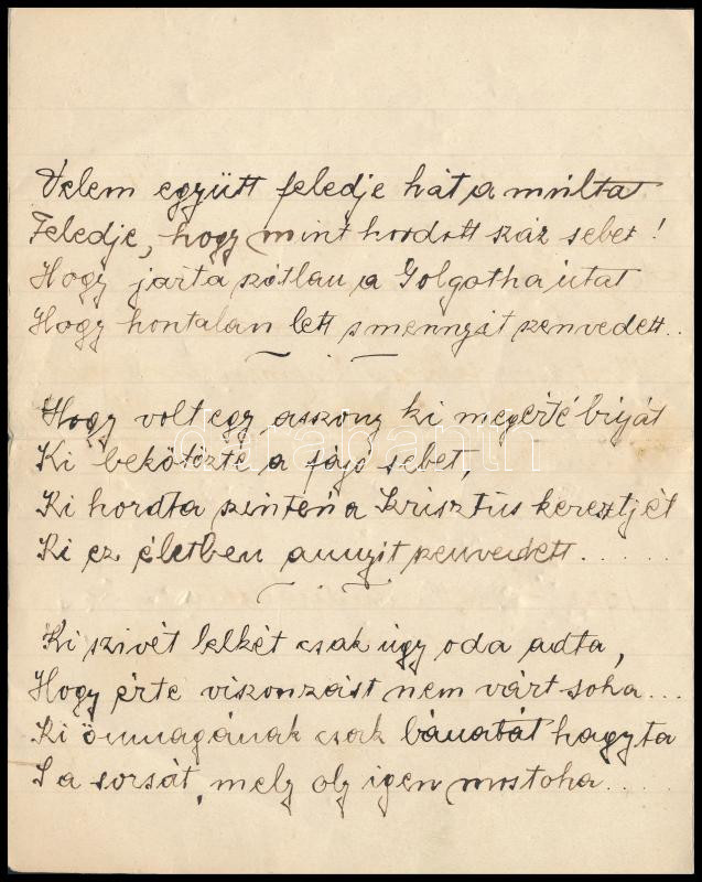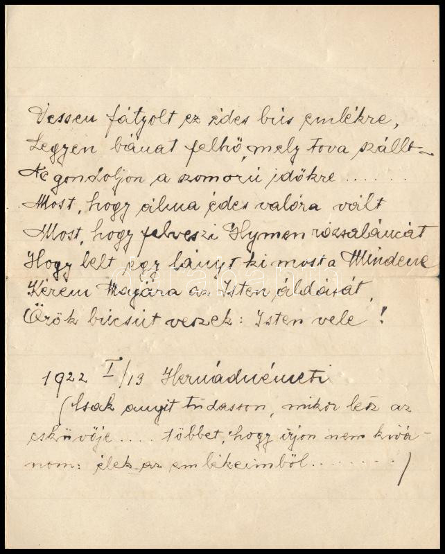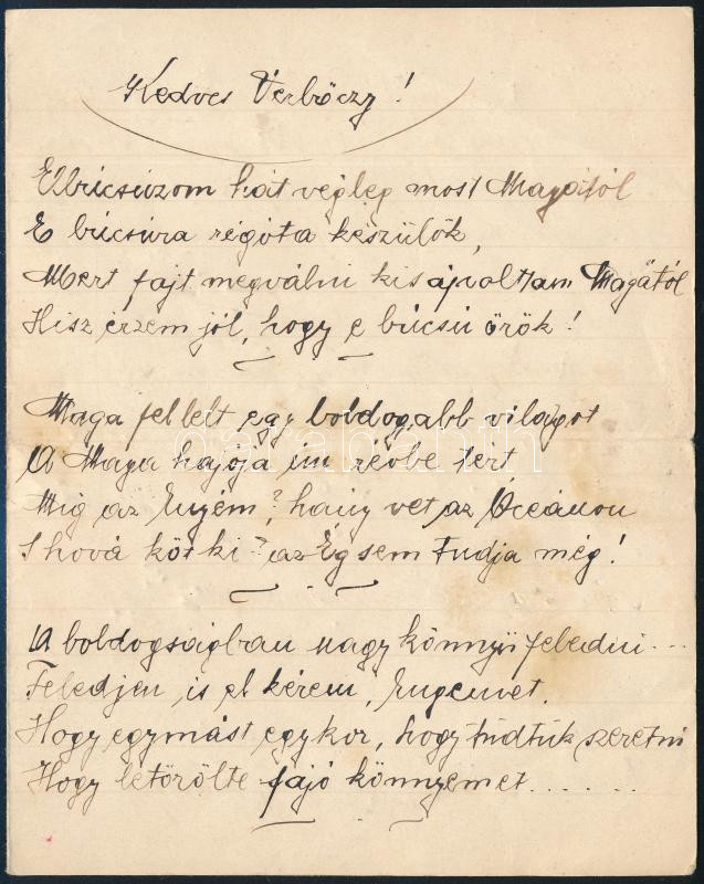1922 VerbÅ‘czy Kálmán (1888-1967) honvéd századosnak, a Székely Hadosztály volt zászlóaljparancsnokának cÃmzett búcsúvers, feltehetÅ‘leg egy korábbi szerelmétÅ‘l, aki esküvÅ‘je hÃrérÅ‘l értesülve Ãrta neki e sorokat. 3 kézzel Ãrt oldalon.