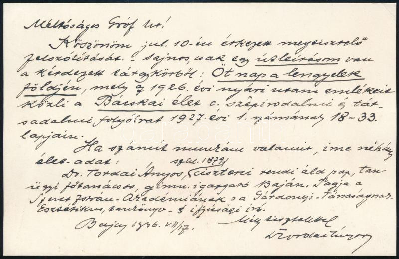 1936 Tordai Ányos történeti szakíró autográf levele gróf Domszky Pálna... https://www.darabanth.com/hu/441-Gyorsarveres/441.0/Mutargy-papirregiseg-egyeb/Tortenelmi-dokumentumok-keziratok-erdekessegek~500023/1936-Tordai-Anyos-torteneti-szakiro-autograf-levele-grof-Domszky-Palnak-lengyel-konyverol~II2905508
