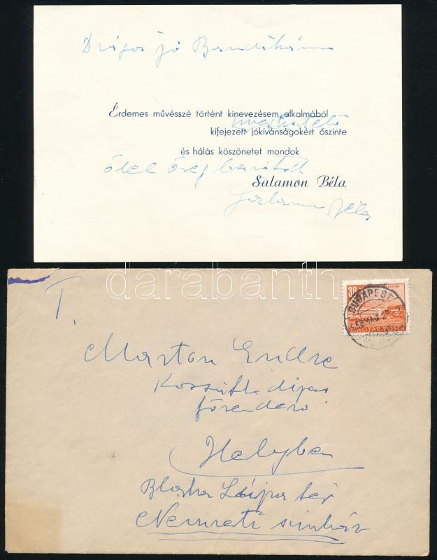 1958 Salamon Béla (1885-1965) színész köszönő nyomtatványa kézírással kiegészítve, saját kézzel aláírva, saját kézzel címzett borítékban, Marton Endre rendező részére elküldve